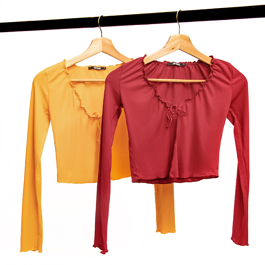 Casual and comfy – Polo con cuello bote manga larga & Pant Palazzo con cinta WINK, disponible en gris.